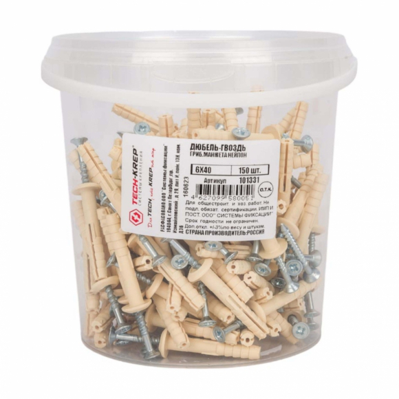 Дюбель-гвоздь Tech-Krep 6x40 гриб манжета полипропилен 500шт ведро 113143