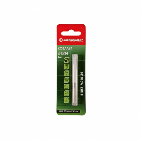 Сверло по металлу БОЕКОМПЛЕКТ Кобальт 1.0x34мм 2шт B1055-M010-34