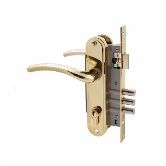 Замок врезной АЛЛЮР 132/3 GP латунь 4кл с ручками 12 Предназначен для установки в деревянные двери толщиной до 40мм, правого и левого открывания. Дверь может быть закрыта на защелку и открыта с помощь