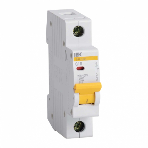 Авт выкл IEK ВА47-29 1Р 16А 4 5кА х-ка С , Количество полюсов: 1, Номинальный ток: 16 А, Характеристика срабатывания - кривая тока: C, Макс сечение входящего кабеля: 25 мм², Тип монтажа: на DIN-рейку,