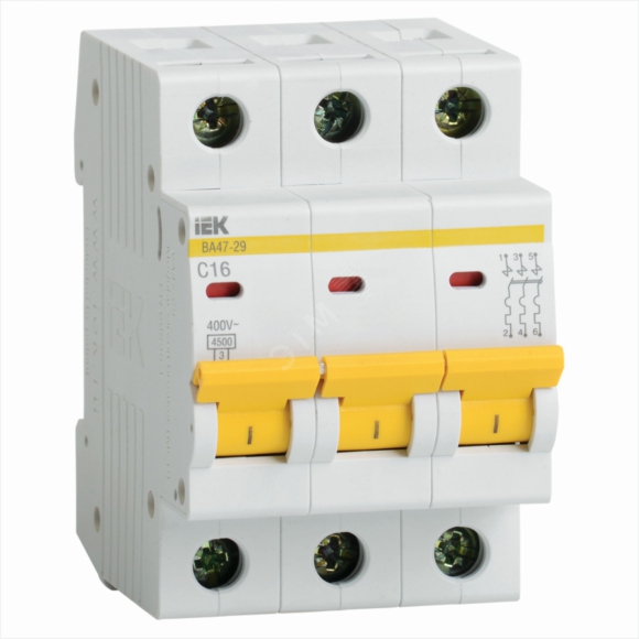 Авт выкл IEK ВА47-29 3Р 16А 4 5кА х-ка С , Количество полюсов: 3, Номинальный ток: 16 А, Номинальное рабочее напряжение: 400 В, Степень защиты - IP: IP20, Тип монтажа: на DIN-рейку