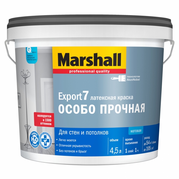 Краска водоэмульсионная Marshall EXPORT 7 BC матовая латексная для стен и потолков моющаяся 4.5л