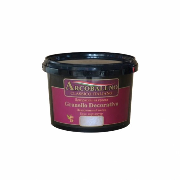 Краска Arcobaleno Granello Decorativa декоративная акриловая с кварцевым наполнителем для внутренних работ. Сочетает в себе переливы гладкой глянцевой поверхности и шероховатой песчаной текстуры декор