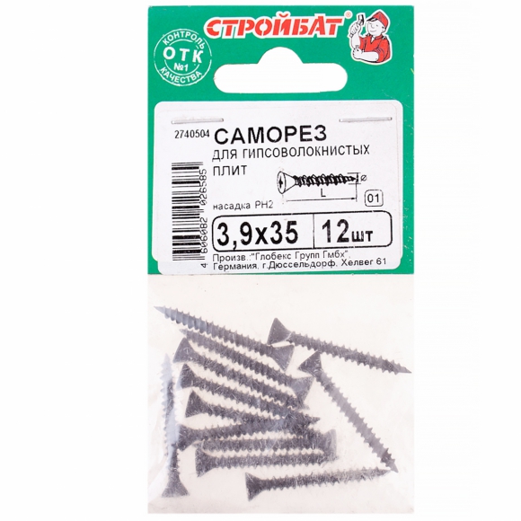 Саморезы СтройБат д/гипсоволокнистых плит фосфатирован 3.9x35 12шт 271761