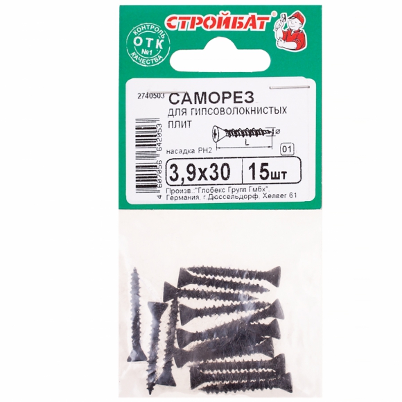 Саморезы СтройБат д/гипсоволокнистых плит фосфатирован 3.9x30 15шт 61661