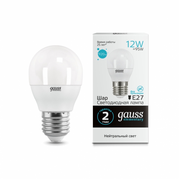 Лампа Gauss Elementary Шар 12W 920лм 4100K Е14 LED /50