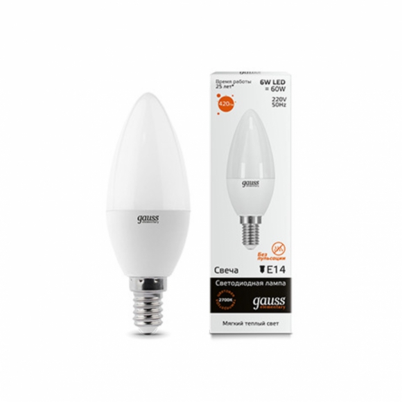 Лампа Gauss LED Elementary Свеча 6W E14 3000K 1/10/50