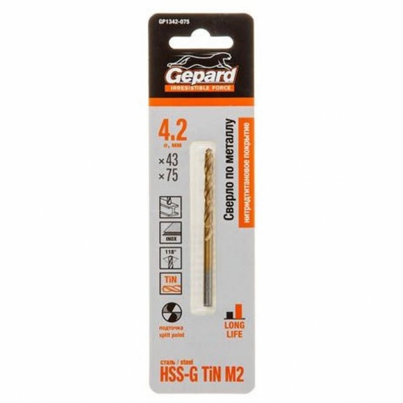 Сверло GEPARD по металлу 4.2мм нитридтитан покрытие GP1342-075