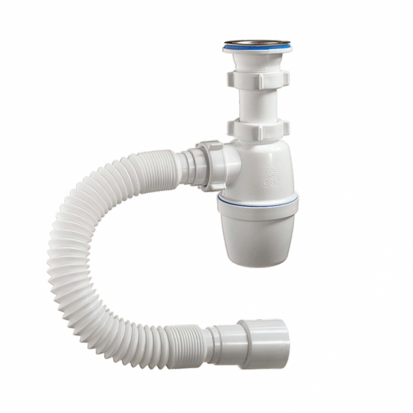 Сифон ОРИО двойной бутылочный с одним отводом с переливом и гибкой трубой 40-40/50 3 1/2х40