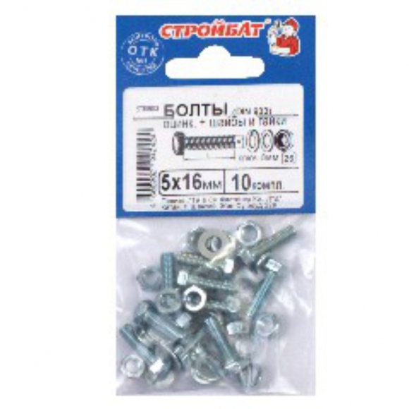 Болт DIN 933 М 5x16 с гайкой и шайбой белый цинк 10 шт,тип резьбы: полная головка: шестигранная материал: сталь покрытие: оцинкованное