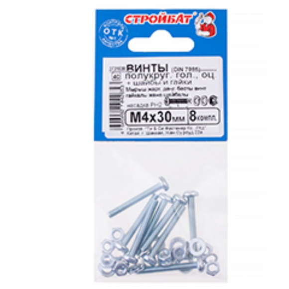 Винты пкр. DIN 7985 М4x30 с гайк.и шайб. белый цинк 8 шт,с полукруглой головкой, полной метрической резьбой и крестообразным шлицем