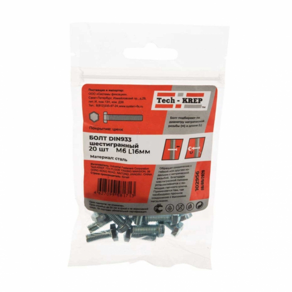 Болт Tech-Krep DIN933 с шестигранной головкой оцинк М6х16 20шт пакет
