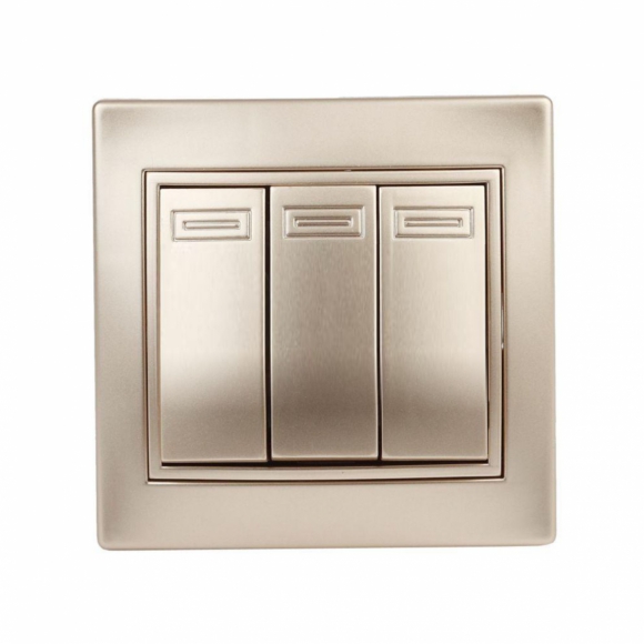 Выключатель Intro Plano 3-кл 10А-250В шампань, Каркас механизма - Поликарбонат,Количество кабелей - 2х2.5мм2, Комплектация - механизм в сборе, Соединения - клеммы винтовые,Класс защиты - IP20,Материал