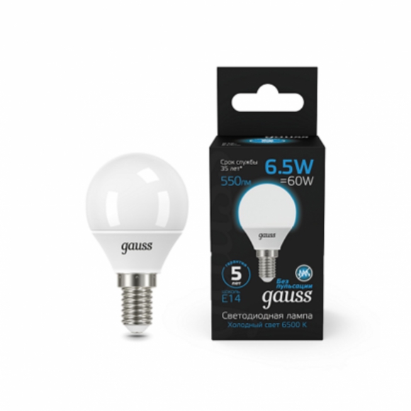 Лампа Gauss Шар 6.5W 550лм 6500K E14 LED /50