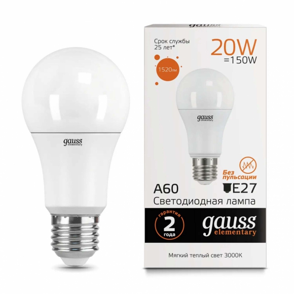 Лампа Gauss Elementary A60 20W 1520lm 3000K E27 LED