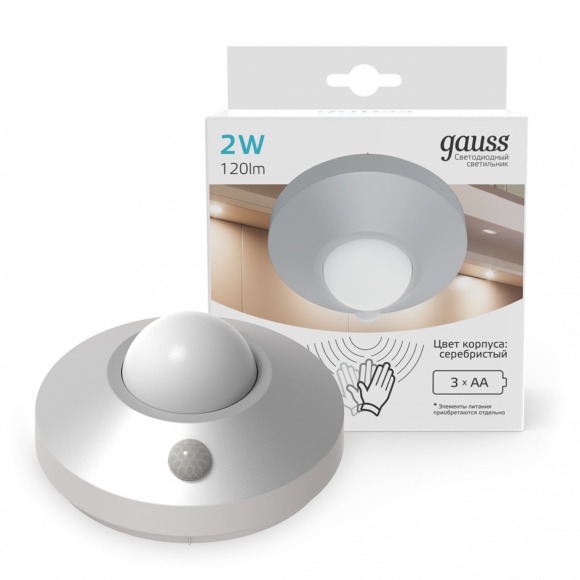 Светильник сенсорный Gauss многофункц автономный 2W 86х47 круг серебро