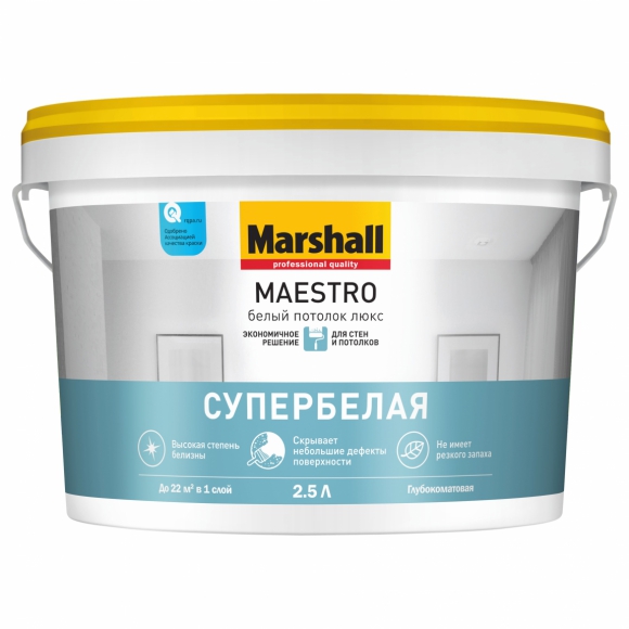 Краска водоэмульсионная Marshall MAESTRO Белый потолок ЛЮКС глубокоматовая белоснежная для стен и потолков 2.5л