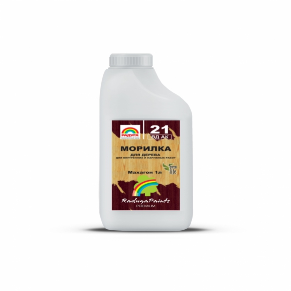 Морилка РАДУГА-21 акриловая для дерева проявляет натуральный рисунок древесины,делает её поверхность блестящей , в состав входит антисептик цвет махагон 1л